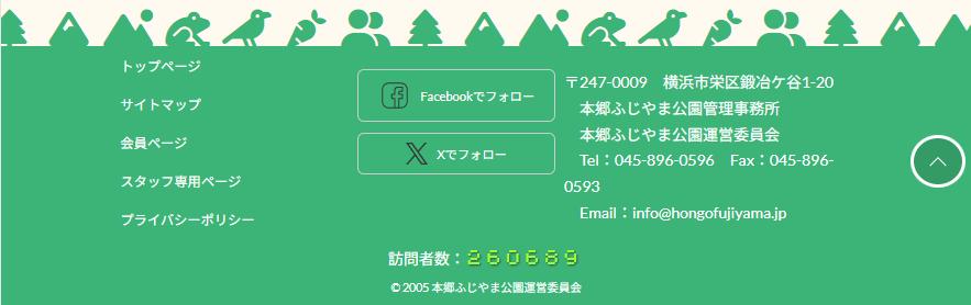 公式サイトのトップページや各個別ページの下の部分(フッター)には、Facebookでフォロー、Xでフォロー のリンクを設けています。本郷ふじやま公園のページをフォローしていただければ、公式サイトのお知らせや体験教室・イベントの記事が掲載された時に、各SNSにも投稿されますので、ぜひフォローをお願いします。