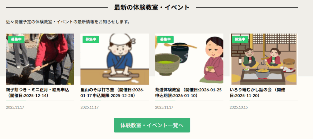 トップページには、最新の体験教室・イベントが4件のみ表示されていますが、[体験教室・イベント一覧へ]のボタンを選択すれば、すべての体験教室・イベントの記事がご覧いただけます。